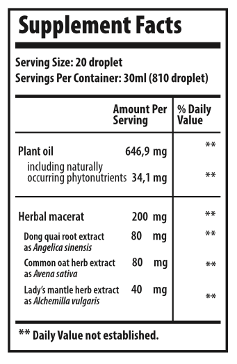 Ingredients: Made with plant oil, naturally occurring phytonutrients, along with Dong Quai root extract (Angelica sinensis), Oat herb extract (Avena sativa) and Lady's Mantle extract (Alchemillae), natural orange flavor, natural clove flavor.