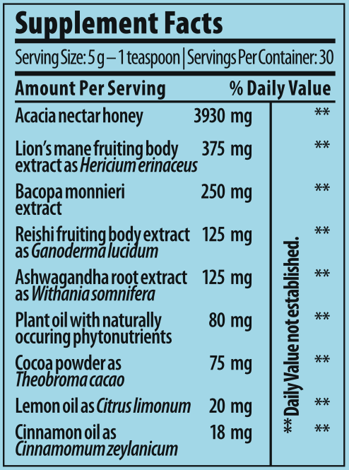 INGREDIENTS: Acacia nectar honey, extract from lion's mane fruiting bodies (Hericium erinaceus), extract from Bacopa monnieri herb, extract from reishi fruiting bodies (Ganoderma lucidum), extract from ashwagandha root (Withania somnifera), plant oil with phytonutrients, cocoa powder (Theobroma cacao), lemon oil (Citrus limonum), cinnamon oil (Cinnamomum zeylanicum). The product contains sulfur dioxide and sulfites naturally found in medicinal mushroom extracts.