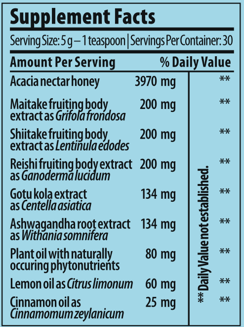 INGREDIENTS: Acacia honey, extract from maitake fruiting bodies (Grifola frondosa), extract from shiitake fruiting bodies (Lentinula edodes), extract from reishi fruiting bodies (Ganoderma lucidum), extract from gotu kola (Centella asiatica), extract from ashwagandha root (Withania somnifera), plant oil with naturally occurring phytonutrients, lemon oil (Citrus limonum), cinnamon oil (Cinnamomum zeylanicum).